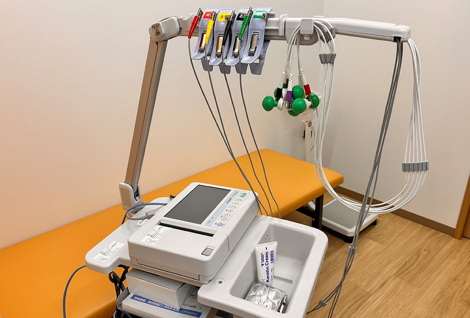 心臓のリズムや電気信号を測定する機器です。当クリニックでは、正確でスピーディーなデジタル心電計を導入しており、不整脈や狭心症、心筋梗塞などの異常を早期に発見できます。短時間で検査でき、身体への負担も少なく安心してご利用いただけます。