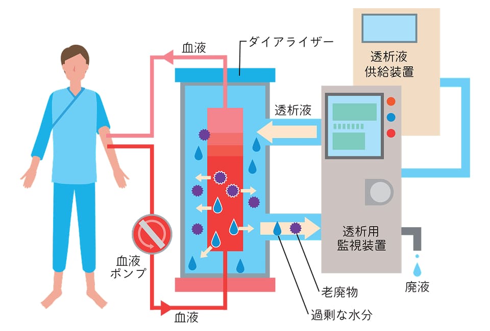 透析治療では、専用の機械でこれらを体外へ排出し、電解質や水分のバランスを整えます。健康と日常生活を維持するために欠かせない医療です。